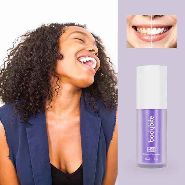 V34 využíva technológiu korekcie farieb na viditeľné zvýšenie jasu vášho úsmevu. Pretože fialová je doplnkovou farbou k žltej, zloženie pomáha vyvážiť nežiaduce žlté tóny pre rovnomernejší a žiarivejší vzhľad. Výsledkom je okamžite sviežejší úsmev – bez drsných ošetrení alebo zložitých krokov.