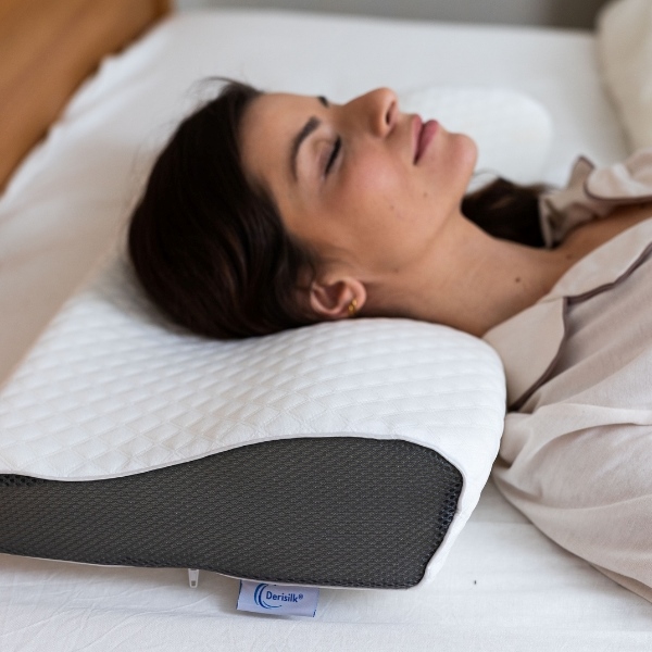 Vankúš Derisilk udržuje vhodnú teplotu počas celého roka. Jeho tvar, prispôsobený prirodzenému zakriveniu krku, uvoľňuje napätie, znižuje hádzanie a otáčanie počas spánku a pomáha predchádzať bolestiam chrbta.